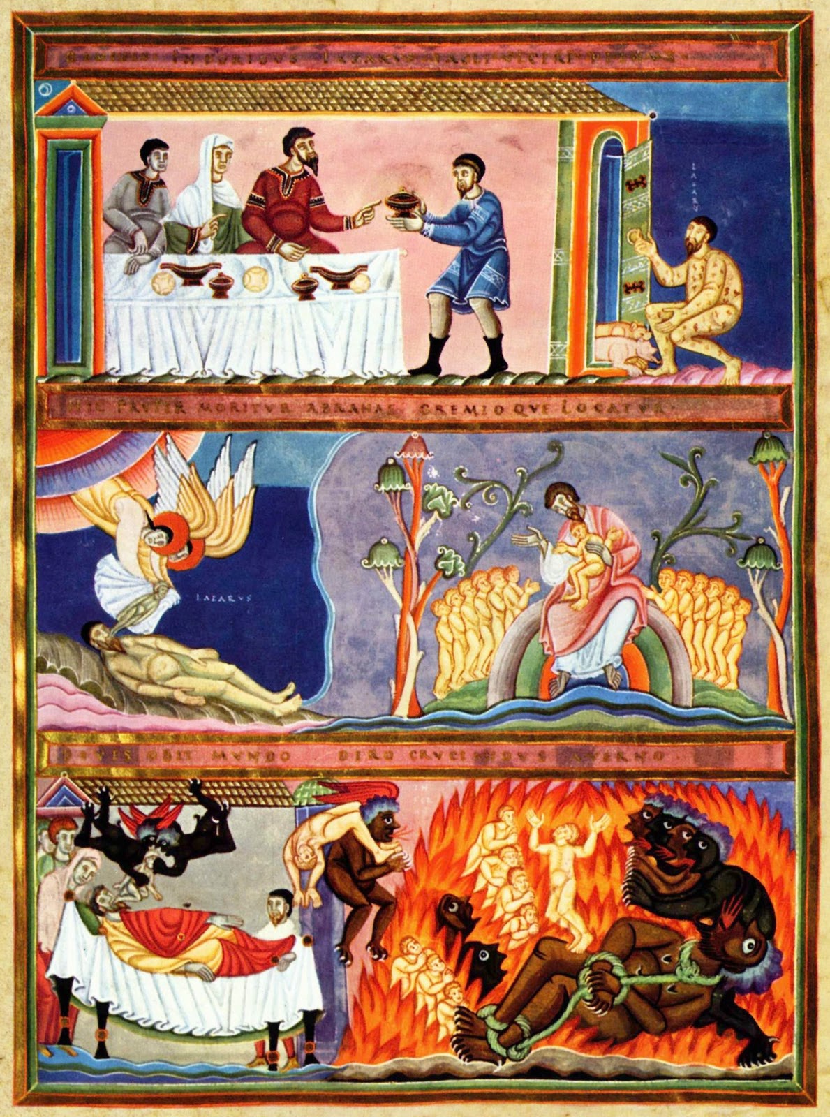 Recently I came across a fascinating illustration of the story of Lazarus and the rich man. It is from the Codex Aureus Epternacensis, an illustrated gospel manuscript from the 11th century.