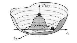 Imagine the ball in the above quantum field diagram is a marble, initially perched at the top of a slope. The initial condition is one of perfect balance, perfect harmony. This condition, however, is inherently unstable. Once the marble is released it is inevitable that the marble will roll down the slope. Which way? To the left? To the right? Who knows. All we can know is that, without support, it will roll till it finds itself in a more stable but more imbalanced state. It can roll around the bottom, even to the opposite side, but it remains imbalanced. For while the field is symmetric along the horizontal axis, it is asymmetric along the vertical axis.