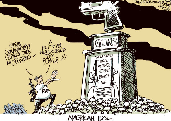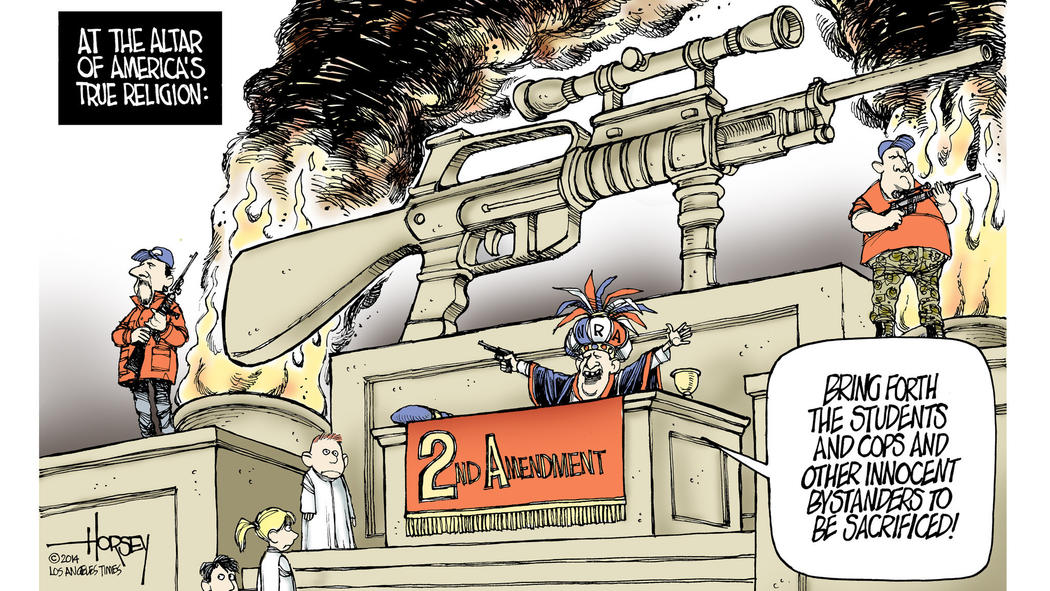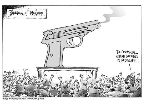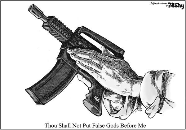 I often wonder what god is actually being worshipped in conservative America. But I am far from alone in that. Here are a score of satirical depictions of American gun worship.