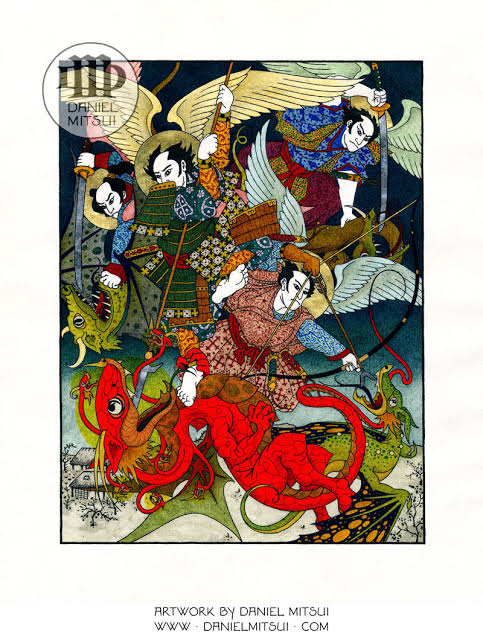 Daniel Mitsui is an artist from Indiana who who makes minutely detailed ink drawings. His collection includes a number of works in Japanese (Ukiyo-E) style. The one above is inspired by Revelation 12 where a great battle breaks out in heaven between Michael and his angels against the dragon and his angels. For more see https://www.danielmitsui.com/