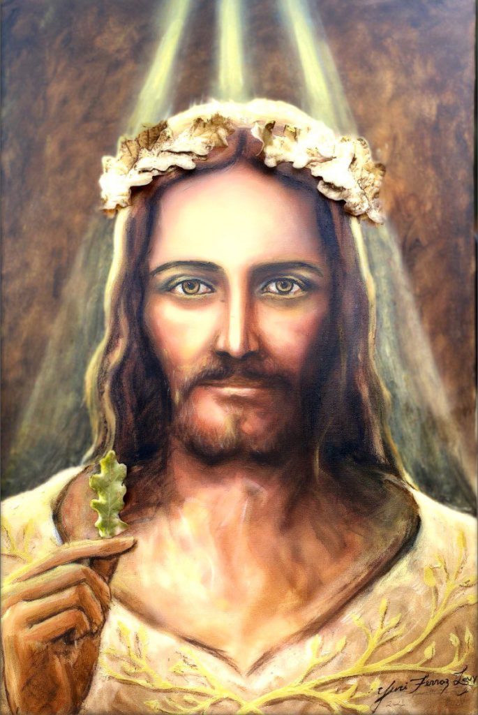 Yuri Levi, the artist, is a member of the Order of Bards, Ovates, and Druids (OBOD) was inspired by the question: what it would have been like if Jesus had been born among druids? In describing his creative process he says, “I used real leaves from an Oak tree that I have grown, to make a golden crown and place a leaf in his hand, inviting us to simplicity and the peace of the woods”.