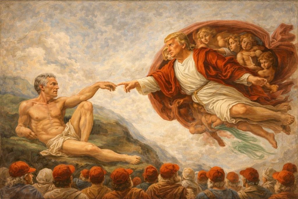 After posting an AI generated image of himself as the Messiah, Trump has no only angered Christians but sparked a flurry of memes mocking his hubris. This one mimics the Sistine Chapel painting of God creating Adam, though in this image its Trump and Epstein who are the focus.